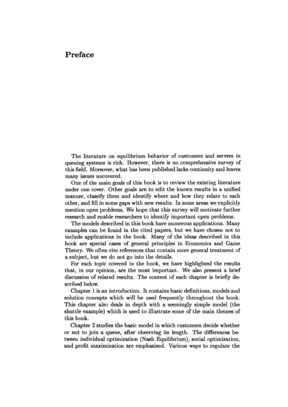 第二章研究了基本模型,消费者在观察排队长度之后决定是否加入排队。个体组织(纳什均衡)、社会组织和盈利最大化的不同很重要?我们会讨论规制排队论的许多方式及引导消费者以社会期望的方式行事