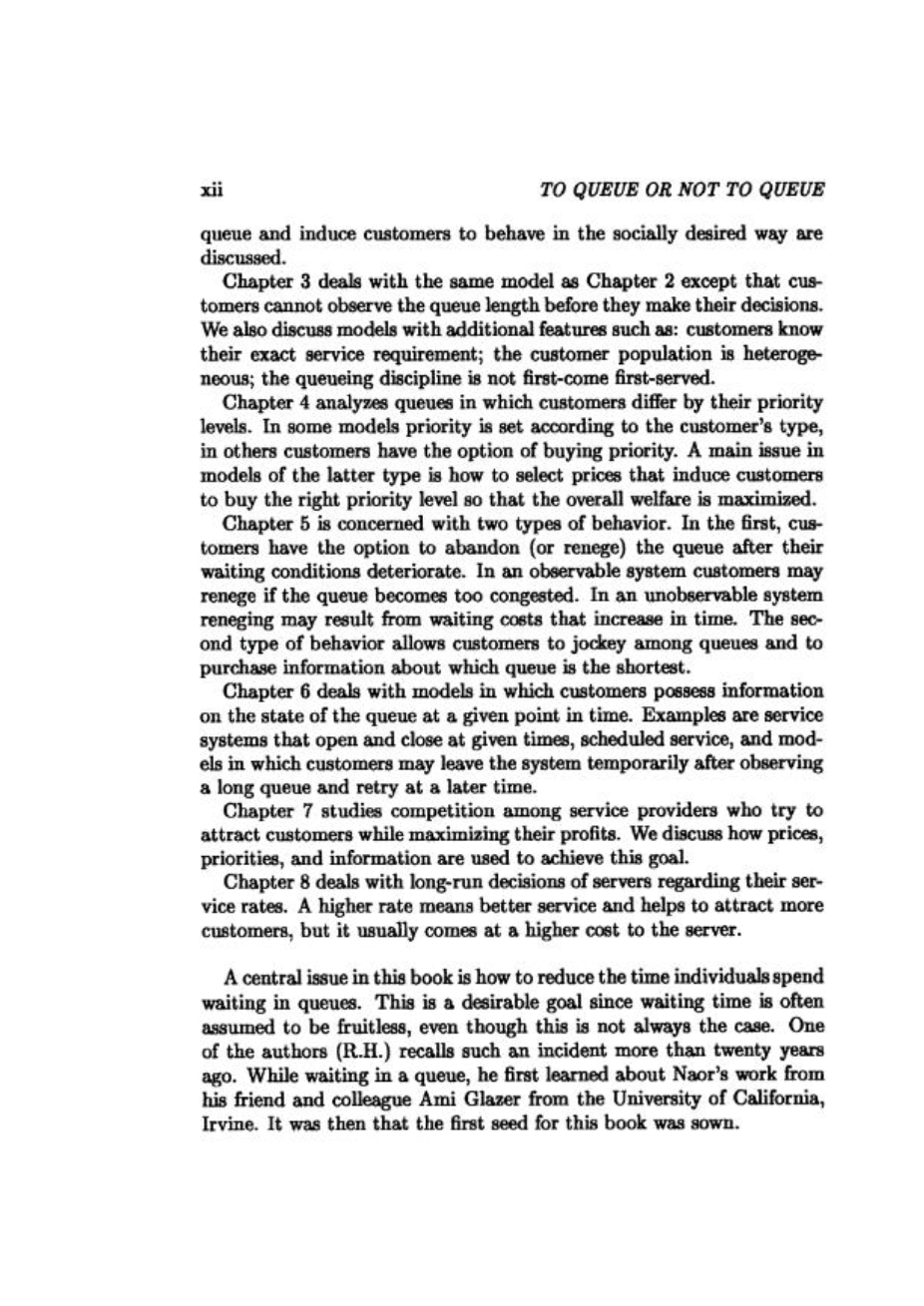 本书的中心问题是,如何减少个体花在排队上的时间。这是一种令人满意的目标,因为等待时长通常被认为是徒劳的,尽管情况并非总是如此。一个作者R.H.回忆起20年前的一个偶然。当排队等待时,他在Ivrine的加利福尼亚大学从他的朋友和同事Ami Glazer那里第一次看到了Naor的著作,自此为本书播下第一粒种子。