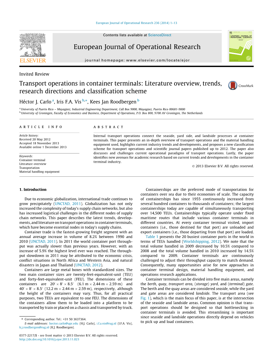 内部运输操作连接集装箱码头的海边,码头侧和陆侧过程。本文深入介绍了运输操作和使用的物料搬运设备,重点介绍了当前的行业趋势和发展,并提出了一个新的运输操作分类方案和截至2012年发布的科学期刊论文。本文还讨论和挑战当前运输业务的运作范例。最后,本文根据集装箱码头行业的当前趋势和发展确定了新的学术研究途径。