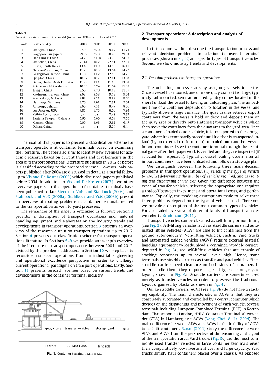 本文的其余部分安排如下:部分2 提供运输操作和物料搬运设备的说明,并详细阐述了运输业务的行业趋势和发展。部分3 概述了截至2012年的运输业务研究成果4 介绍了我们的运输操作文献分类方案。在章节中5–9 我们提供了2004年至2012年间运输业务文献的深入概述,并按照所解决的问题进行了划分。在节中10 我们退后一步,从工业工程和卓越运营的角度重新考虑运输业务,以挑战当前运输业务的运营范例。最后,部分11 根据集装箱码头行业的当前趋势和发展,提出研究途径。