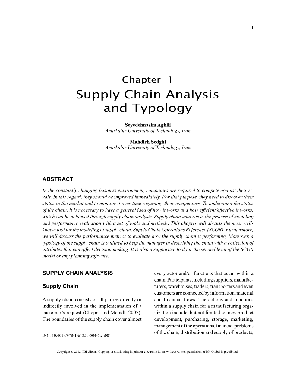 在不断变化的商业环境中,企业需要与竞争对手竞争。在这方面,企业应立即加以改进。为了这个目的,他们需要发现自己在市场中的地位,并且随着时间的推移监控其竞争对手。想要理解供应链的状态,有必要对于它的工作原理和工作效率和有效性有一个总体性的了解,这可以通过供应链分析来实现。供应链分析是使用一系列工具和方法进行建模和性能评估的过程。本章节将会讨论供应链建模最常见的一种工具—— Supply Chain Operations Reference (SCOR)。我们还将更进一步讨论一种性能标准来评估供应链的表现。此外,本文还将概述供应链的类型学来帮助管理者使用可能影响决策的一系列属性来描述供应链。它也是SCOR模型或任何规划软件的第二级支持工具。
