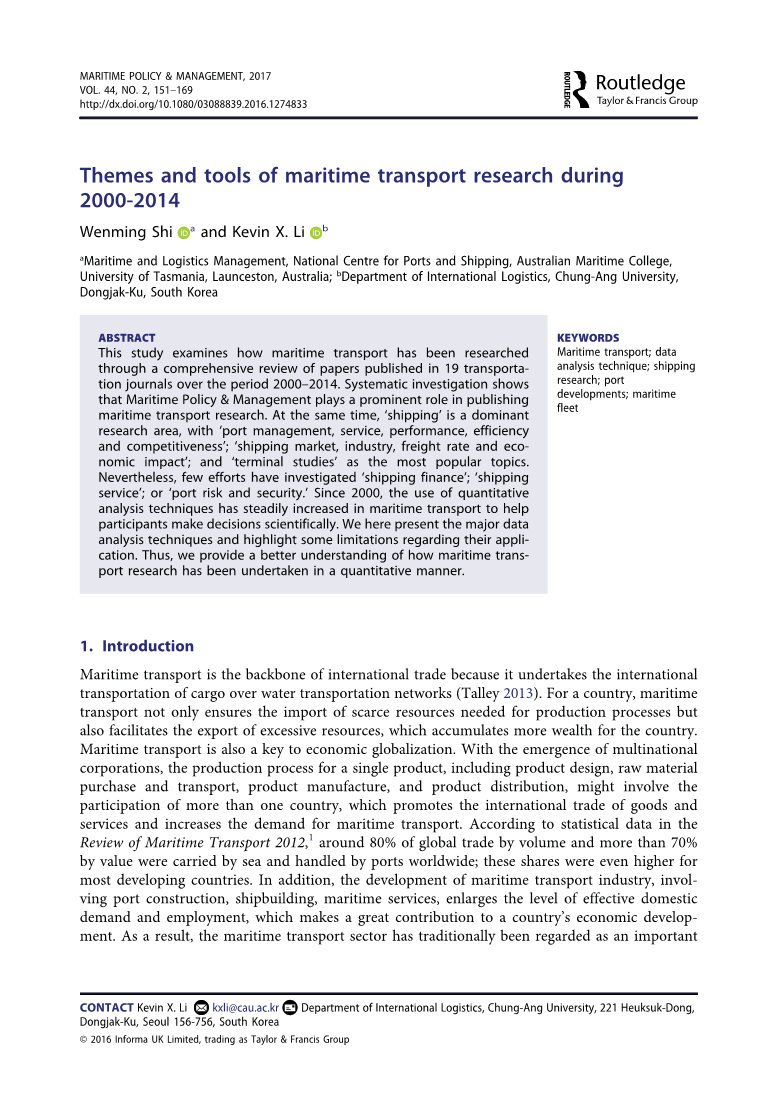 在解决海上运输的主要研究方向后,我们进一步考虑了研究方法,即研究人员如何研究这些主题和感兴趣的主题。 据我们所知,很少有研究从经济和管理的角度对海上运输进行全面的方法评估。 例如,Talley(2013)声称,相关性研究的方法可以分为制定,统计推断,优化,调查,模拟(SI),命题及其他。 但是,这种分类有点含糊不清,对于开展具体的海运问题研究提供了很少实际的建议。 Woo等人 (2011)采用更详细的分类方法,将港口研究中使用的研究方法划分为调查,访谈,经济建模(EM),数学建模,SI,案例研究(CS),概念性工作,档案分析和内容分析。