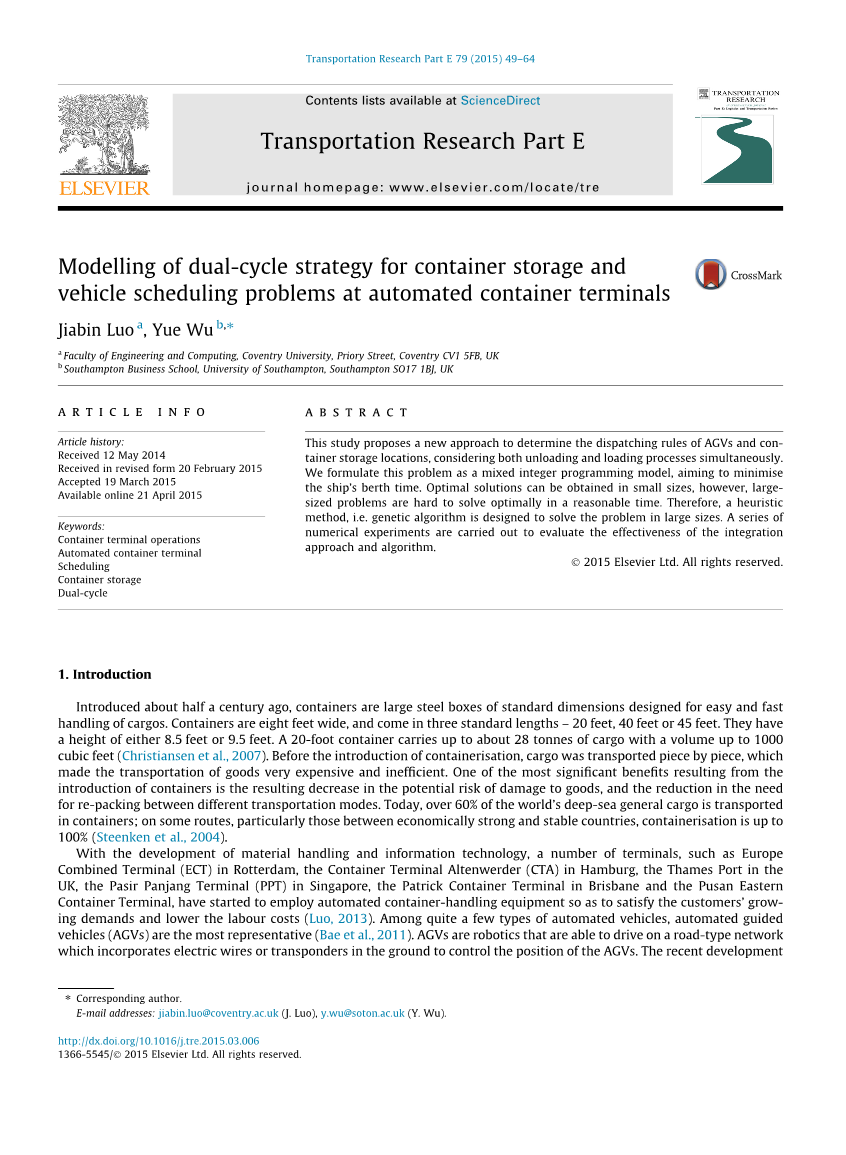 集装箱码头的效率在很大程度上取决于码头资源配置的有效性(车辆/起重机/位置)。在这方面,我们考虑了整合车辆调度和集装箱存储问题在自动化集装箱码头中同时进行卸货和装载过程。来自集装箱处理的观点来看,自动集装箱码头具有其自己的特定特征,即自动化车辆/设备,旨在降低劳动力成本,因此需要对该综合体进行更高级的规划环境。这项研究的动机来自于车辆/起重机调度和集装箱储存的事实分配问题是相互关联的,这是以前研究中没有考虑的一个因素。目标是增加通过缩短船舶停泊时间来实现自动化集装箱码头的生产力。