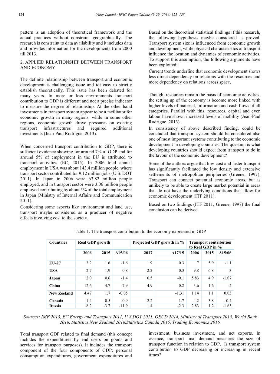 这项研究的结果是基于对世界主要经济体的运输系统绩效和经济增长的同时分析。相应的,主要经济实体的实际国内生产总值和运输部门的就业率已被详述。由于有些国家缺乏关于交通运输中就业部分的数据,因此有关这些国家的研究仅限于实际国内生产总值。
