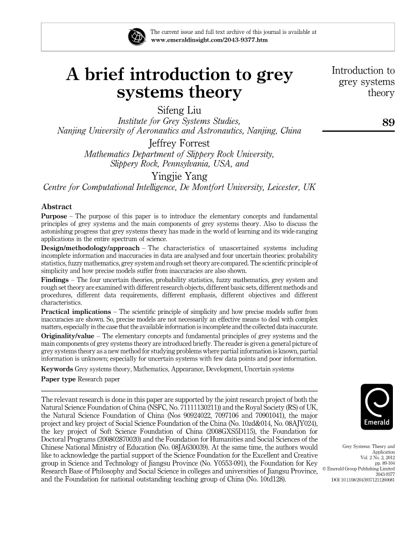 1982年,North-Holland在国际期刊System Contral上发表了灰色系统理论中的第一篇论文Julong Deng发表的“灰色系统的控制问题”。 同年,华中科技大学出版了第一篇由邓聚龙撰写的关于中文灰色系统理论的论文。这些论文的发表标志着交叉学科灰色系统理论的正式出现。这些作品一出现,就立即引起了众多来自世界各地学者和科学界的关注。众多知名科学家强烈支持此类研究的有效性和生计。许多年轻学者积极参与灰色系统理论的研究。这些年轻学者以极大的热情将理论提升到了新的高度,并将其成果应用于各个领域。特别是在很多领域的成功应用已经赢得了国际学术界的关注。目前,来自中国,美国,英国,罗马尼亚,南非,德国,日本,澳大利亚,加拿大,波兰,西班牙,古巴,韩国,俄罗斯,土耳其,荷兰,伊朗等国的大量学者参与其中在灰色系统理论的研究和应用中。1989年,英国杂志“灰色系统杂志”发布。 目前,本出版物由英格兰INSPEC(前科学文摘),美国数学评论,科学引文索引和世界各地其他重要索引机构编制索引。 1997年,一个名为“灰色系统杂志”的中国出版物在台湾发行。这是在2004年晚些时候,这本出版物成为全英文。 2011年,英国Emerald公司发布了一本名为“灰色系统理论与应用”的新期刊,由南京航空航天大学(NUAA)灰色系统研究所编辑编写。 目前世界上有数千种不同的专业期刊已经接受并发表了灰色系统理论论文。 在撰写本文时,由计算机械协会(美国),模糊数学通讯(台湾),Kybernetes:由Emerald赞助的国际系统与控制论杂志发表了几篇有关灰色系统理论的特刊。