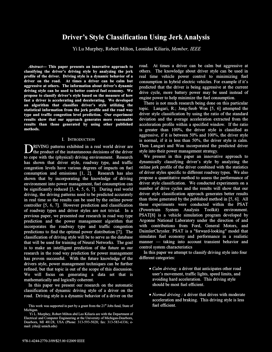 关于这个特定的主题没有太多的研究正在进行。 Langari,R; Jong-Seob Won试图通过使用在指定窗口内从加速度曲线图中提取的标准偏差和平均加速度的比率来进行驾驶员风格分类。 如果比例大于100%,则驾驶员风格被分类为侵略性,如果在50%和100%之间,则驾驶员风格正常,如果比例小于50%,则驾驶员风格是平静的。 然后Langari和Won将预测的驾驶员风格融入到他们的动力管理策略中。