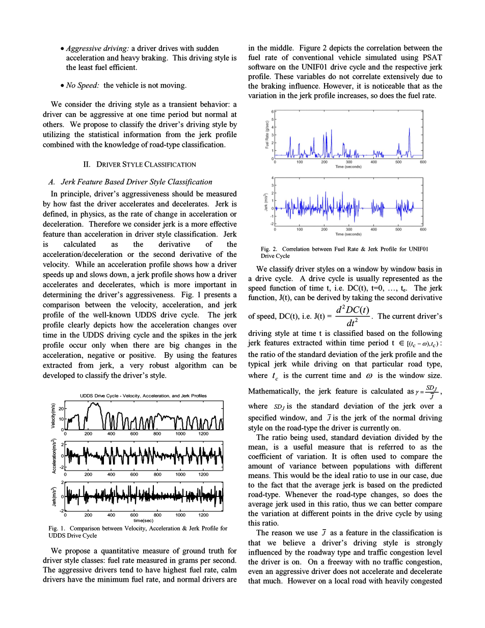 我们为驾驶员风格分类提出了一个基于实际数据的定量测量方法:以每秒克数计量的燃料率。 富有侵略性的司机往往有最高的燃油率,冷静的司机有最低燃油率,正常的司机在中间。 图2描绘了在UNIFO1驱动循环上使用PSAT软件模拟的传统车辆的燃料消耗率与相应的加加速度曲线之间的相关性。由于制动的影响,这些变量并不广泛相关。然而,值得注意的是,随着加加速度曲线变化的增加,燃料率也增加。