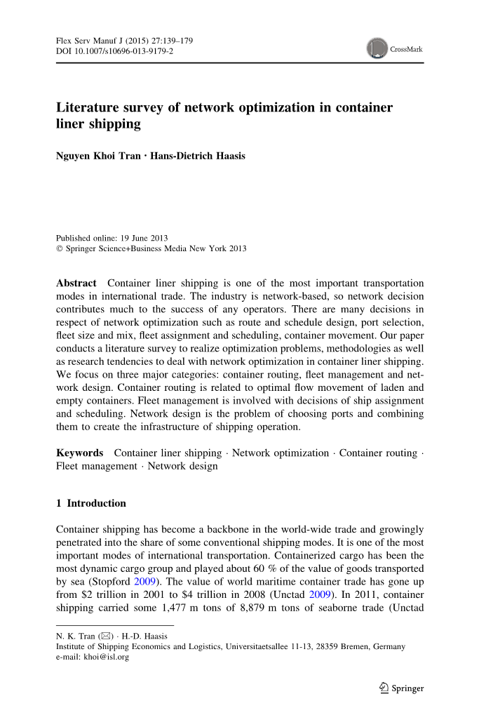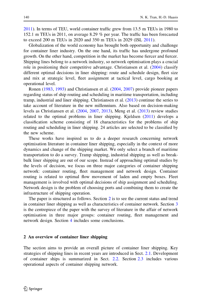 这些作品激发了我们对集装箱班轮运输网络优化文献的深入研究,特别是在动态和航运市场变化的背景下。我们只选择海运的一个分支来做一个调查。不定期船,工业航运以及散装班轮运输都超出了我们的范围。而不是接近最优的研究水平的决定,我们专注于三个主要类别的集装箱船舶网络:集装箱路由,车队管理和网络设计。集装箱运输与装载和空箱的最优流动有关。