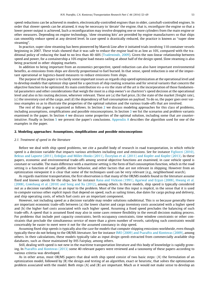 在处理船速问题之前,我们引用了一系列道路交通研究,其中车辆速度是影响包括成本和排放在内的各种属性的决策变量。参见例如Figliozzi(2010)