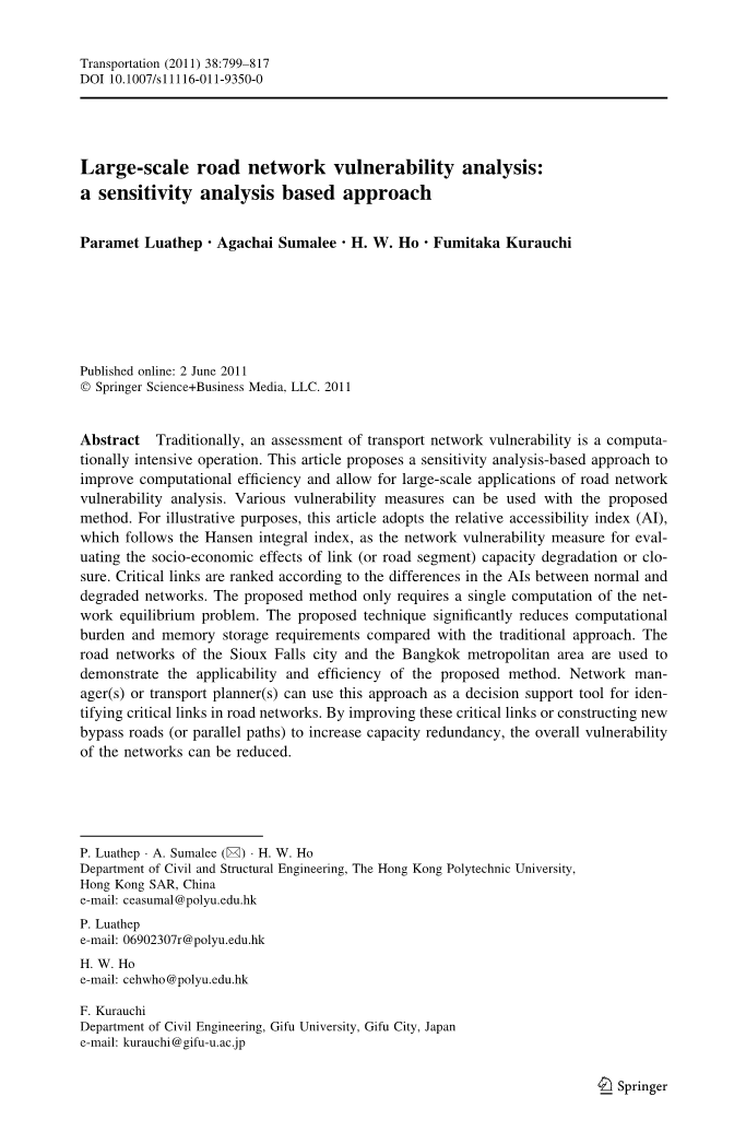 传统上,传输网络脆弱性的评估是计算上的密集运作。本文提出了一种基于敏感性分析的方法,来提高计算效率并允许大规模道路网络脆弱性分析的应用。各种脆弱性措施可以和建议的方法一起使用。为了说明的目的,本文采用了相对可访问性指数(AI),它遵循汉森积分指数作为评估的网络脆弱性度量链路(或路段)容量退化或关闭的社会经济影响。关键链接根据正常和退化的网络在AI中的差异进行排名。所提出的方法仅需要网络的单个计算均衡问题。所提出的技术与传统方法相比,显着减少了计算量和记忆存储。苏福尔斯市和曼谷大都市区的道路网络已经证明了该方法的适用性和有效性。网络管理员或运输计划人员可以使用这种方法作为识别道路网络中的关键链接的决策支持工具。通过改进这些关键环节或构建新的旁支道路(或平行路径)增加容量冗余,网络整体的脆弱性可以减少。