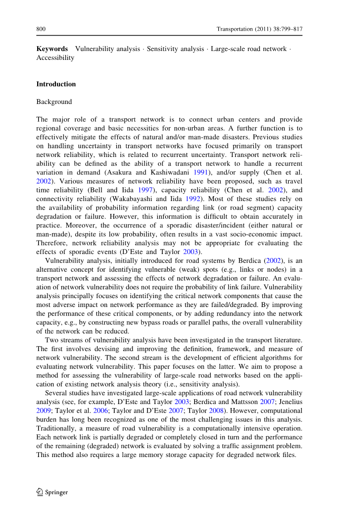 一些研究调查了道路网络脆弱性的大规模应用分析(参见,例如D#39;Este和Taylor 2003; Berdica和Mattsson 2007; Jenelius2009年; Taylor等人2006; Taylor和D#39;Este 2007;泰勒2008)。但是,计算负担一直被认为是本分析中最具挑战性的问题之一。传统上,道路脆弱性的度量是计算密集型操作。每个网络链路都会依次部分降级或完全关闭,并且剩余的(退化的)网络性能是由解决交通分配问题来评估的。此方法还需要较大的内存存储容量以存储降级的网络文件。