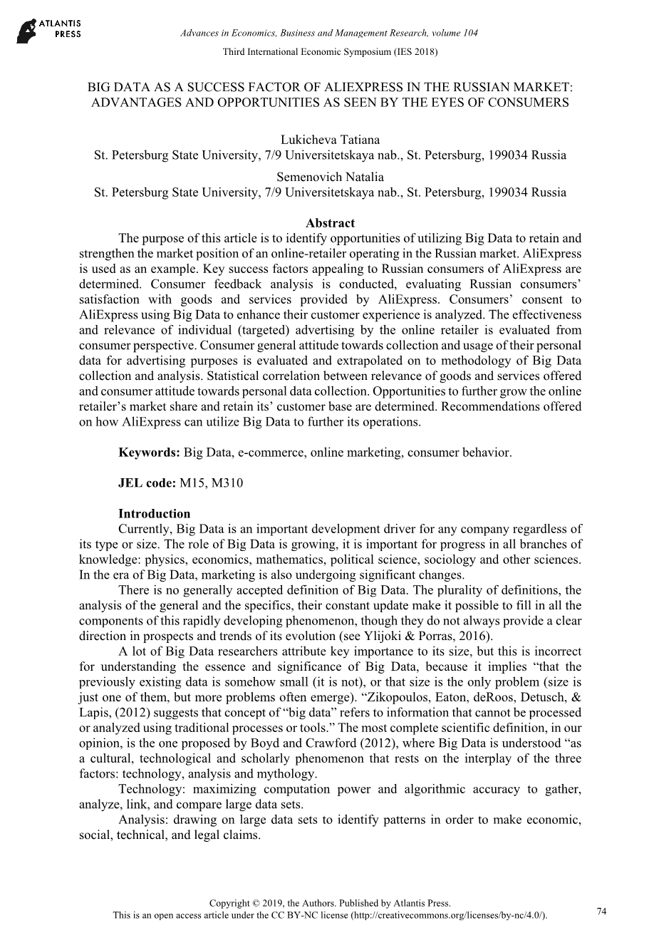 本文的目的是确定利用大数据来保留和保留的机会。加强在俄罗斯市场运营的在线零售商的市场地位。以速卖通作为示例。吸引俄罗斯速卖通消费者的关键成功因素是决心。进行了消费者反馈分析,评估了俄罗斯消费者的对速卖通提供的商品和服务感到满意。消费者同意速卖通利用大数据来增强其客户体验进行了分析。成效在线零售商的个人(目标)广告的相关性从消费者角度。消费者对个人收藏和使用的一般态度评估用于广告目的的数据并将其外推到大数据方法上收集和分析。提供的商品和服务的相关性之间的统计相关性以及消费者对个人数据收集的态度。在线进一步发展的机会确定零售商的市场份额并保留其客户群。提供的建议有关速卖通如何利用大数据进一步开展业务的信息。