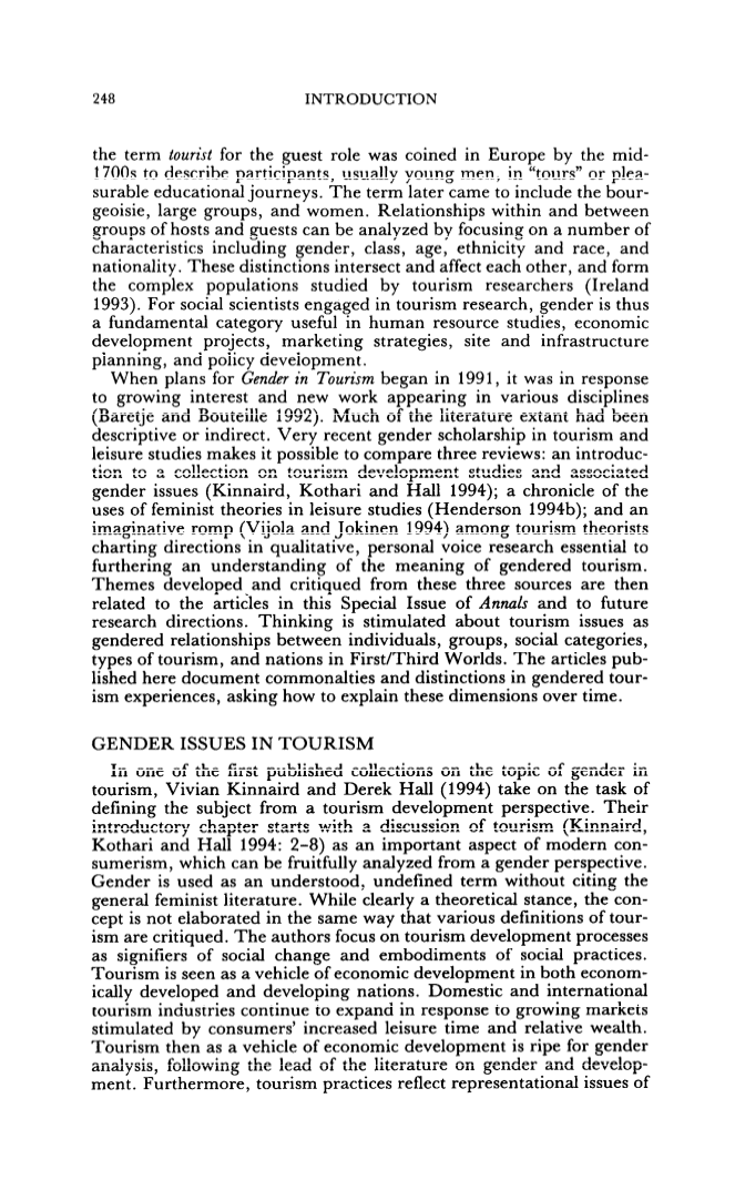 1991年,关于性别旅游的研究开始萌芽,这意味着人们对此的兴趣日益增长以及将有新作文献会在各个学科出现(Baretje and Bouteille 1992)。许多文献叙述都是概括描述性的或者是间接描述。最近在旅游和休闲方面刚获得学术奖学金的性别研究,让我们能够比较得出三个视角:一个是介绍旅游发展研究收集和相关的性别问题(Kinnaird, Kothari and Hall 1994);一个女性主义理论在休闲研究方面的运用(Henderson 1994b)的编年史;还有一个是一个富有想象力和有跳跃性的旅游理论的指引方向从定性、个人语音研究到必不可少的方向推动到性别旅游的内涵和想象力(Vijola and Jokinen 1994)。主题发展和评论这三个来源于在这个特殊的问题和未来的研究方向上的相关的文章。思维是旅游问题中性别关系的刺激产物,包括个人关系、团体关系、社会类别、旅游类别,以及国家之间的关系。这里发表的文章表明了文档中性别旅游体验的共同点和不同点,也揭示了随着时间的推移如何解释这些方面。针对性别的旅游话题,Vivian Kinnaird and Derek Hall(1994)在研究中采取旅游发展的角度来看待这个问题。此项研究作为众多开篇研究的一部分是非常有意义的。他们的介绍章节会以旅游来作为讨论话题。(Kinnaird, Kothari and Hall 1994:2-8)这样的讨论是现代消费学一个非常重要的部分。通过性别的视角来分析旅游特征,旅游业的发展会更加成熟。在过去,性别对于人们来说是一个模糊的概念,甚至是在通常的女性文学里没有性别的专业用语。而明确的理论姿态,该概念并不以相同的方式阐述,旅游业的各种定义批判。尽管有明确的理论立场,这个概念是不是和阐述了旅游业的各种定义的批判一样。作者侧重于旅游开发过程中为社会变革的能指和社会实践的实施方案。旅游业被视为经济发达国家和发展中国家经济发展的一个工具。国内和国际旅游业继续在应对由于消费者的休闲时间增加和相对丰富的刺激而带来的持续增长的市场情况。那么旅游作为经济发展的载体是成熟的性别分析,遵循具有指导意义的文献上对性别和发展的研究。此外,旅游实践反映了主人和客人之间的营销和消费过程中的身份和地位的代表性问题(kinnaid等人,1994),这个问题是由科恩,锥,和史葛讨论出来的。