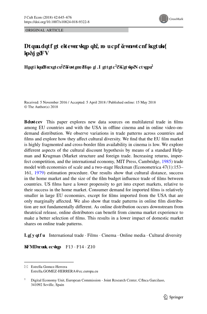 Abstract This paper explores new data sources on multilateral trade in films among EU countries and with the USA in offline cinema and in online video-on-demand distribution. We observe variations in trade patterns across countries and films and explore how they affect cultural diversity.We find that the EU film market is highly fragmented and cross-border film availability in cinema is low. We explore different aspects of the cultural discount hypothesis by means of a standard Helpman and Krugman (Market structure and foreign trade. Increasing returns, imperfect competition, and the international economy, MIT Press, Cambridge, 1985) trade model with economies of scale and a two-stage Heckman (Econometrica 47(1):153–161, 1979) estimation procedure. Our results show that cultural distance, success in the home market and the size of the film budget influence trade of films between countries. US films have a lower propensity to get into export markets, relative to their success in the home market. Consumer demand for imported films is relatively smaller in large EU economies, e