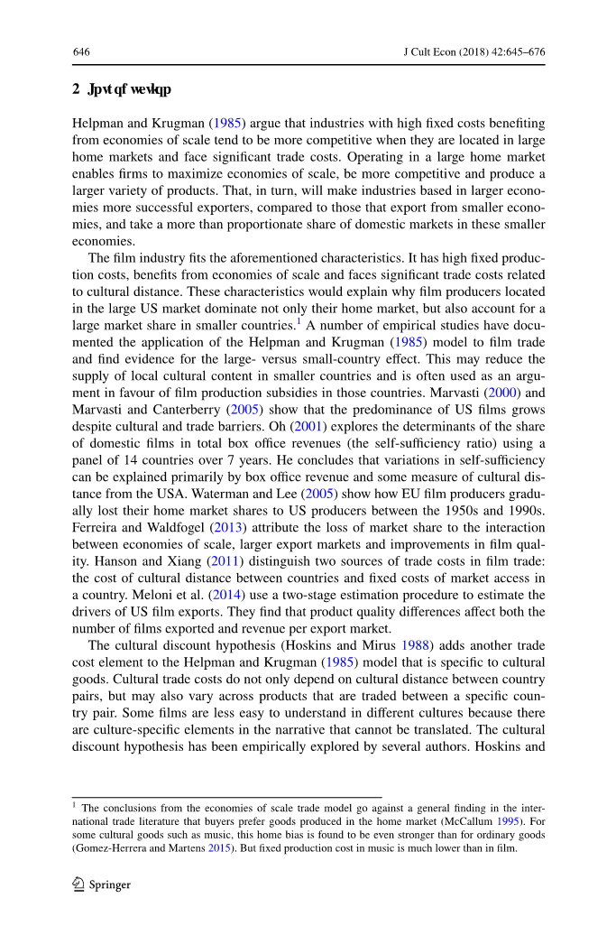 电影业符合上述特点,它有高固定的生产成本,受益于规模经济,并面临与文化距离相关的巨额贸易成本。这些特点将解释为什么位于美国大市场的电影制作人不仅主宰着国内市场,还在较小的国家占有很大的市场份额,许多实证研究记录了Helpman和Krugman(1985)模型在电影贸易中的应用,并为大小国效应找到了证据。这可能会减少较小国家当地文化内涵的供应,并通常用作支持这些国家电影制作补贴的论据。Marvasti(2000)和Marvasti and Canterberry(2005)表明尽管存在文化和贸易壁垒,美国电影的主导地位优势仍在增强。Oh(2001)利用一个由14个国家组成的小组,历时7年,研究国产电影在总票房收入(自给自足率)中所占份额的决定因素。他得出的结论是,自给自足的差异主要可以通过票房收入和与美国之间某种程度上的文化距离来解释。Waterman和Lee(2005)展示了在20世纪50年代到90年代之间欧盟电影制作人如何逐渐将本国市场份额输给美国电影制作人。Ferreira和Waldfogel(2013)认为市场份额丢失是因为规模经济、更大的出口市场和电影质量的提升之间的相互作用。Hanson和Xiang(2011)区分了电影贸易中的两种贸易成本来源:国家间文化距离的成本和一国市场准入的固定成本。Meloni等人(2014)使用二阶估计方法估算美国电影出口的驱动因素,他们发现,产品质量差异既影响电影出口的数量,也影响每个出口市场的收入。