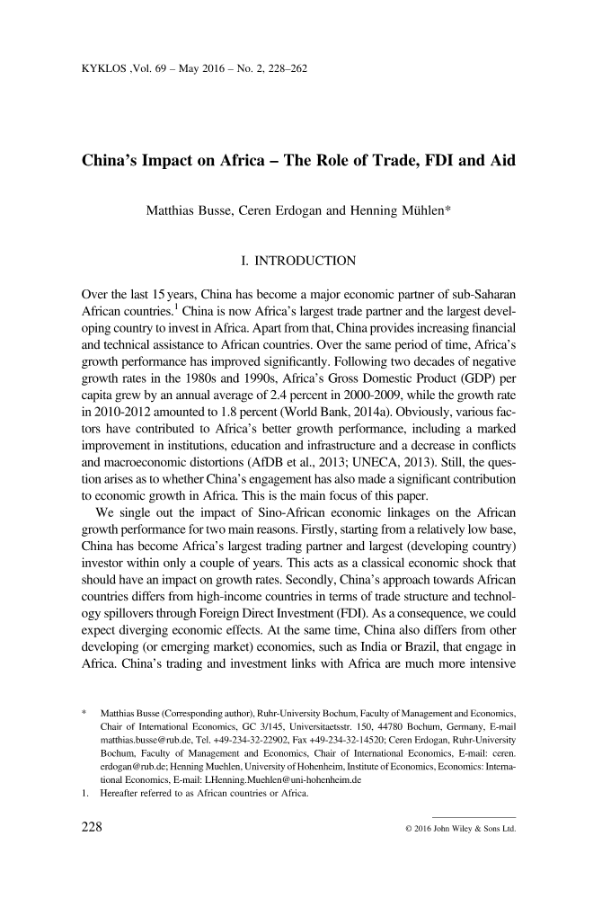 Over the last 15 years, China has become a major economic partner of sub-Saharan African countries. China is now Africarsquo;s largest trade partner and the largest developing country to invest in Africa. Apart from that, China provides increasing financial and technical assistance to African countries. Over the same period of time, Africarsquo;s growth performance has improved significantly. Following two decades of negative growth rates in the 1980s and 1990s, Africarsquo;s Gross Domestic Product (GDP) per capita grew by an annual average of 2.4 percent in 2000-2009, while the growth rate in 2010-2012 amounted to 1.8 percent (World Bank, 2014a). Obviously, various factors have contributed to Africarsquo;s better growth performance, including a marked improvement in institutions, education and infrastructure and a decrease in conflicts and macroeconomic distortions (AfDB et al., 2013; UNECA, 2013). Still, the question arises as to whether Chinarsquo;s engagement has also made a significant contribution to economic growth in Africa. This is the main focus of this paper.