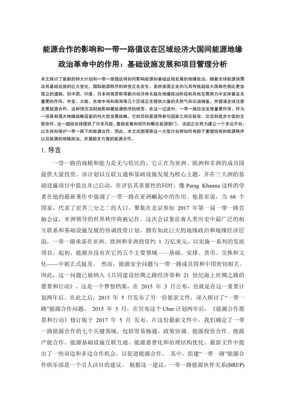 能源合作的影响和一带一路倡议在区域经济大国间能源地缘 政治革命中的作用:基础设施发展和项目管理分析外文翻译资料 2022-08-08 14:48:02 英语原文共 16 页,剩余内容已隐藏,支付完成后下载完整资料 英语译文共 17 页,剩余内容已隐藏,支付完成后下载完整资料 资料编号:[257445],资料为PDF文档或Word文档,PDF文档可免费转换为Word 原文和译文剩余内容已隐藏,您需要先支付 30元 才能查看原文和译文全部内容!立即支付 发小红书推广免费获取该资料资格。点击链接进入获取推广文案即可: Ai一键组稿 | 降AI率 | 降重复率 | 论文一键排版 PREVIOUS NEXT 您可能感兴趣的文章 转基因食品的“风险”和“利益”是否相互依赖?外文翻译资料 中国对外直接投资对自然资源和科学技术的作用外文翻译资料 我国数字经济的国际竞争力研究外文翻译资料 中国网络游戏产业与政府政策外文翻译资料 结合加拿大和美国贸易激励计划,为中小企业设计电子商务跨境分销网络外文翻译资料 知识产权、投资环境和发展中国家的外国直接投资流入外文翻译资料 “一带一路”倡议与中哈油气合作外文翻译资料 国际贸易,发展陷阱和收入不平等的核心–外围结构外文翻译资料 中国文化产业政策外文翻译资料 全球价值链视角下的江苏装备制造业转型升级研究外文翻译资料