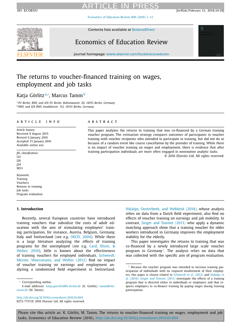 摘要:本文研究了德国“培训券计划”资助的培训所能取得的回报。我们的研究方法是将参与培训的人与打算参加培训却由于随机事件(如培训提供者取消课程)而没有参加培训的人进行比较,然后得出结论。虽然研究结果显示培训对工资和就业没有影响,但有证据表明,在参与培训后,个人能够更多地参与到非常规任务中去。