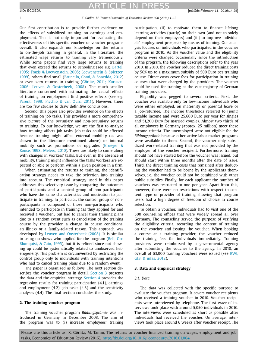 此外,第一次访谈还包括以前参加培训的信息以及参考期为两年的培训课程数量。第二次访谈集中于更新有关培训券兑换,社会人口统计,当前就业状况和当前工作特征的信息。两次访谈之间的培训信息和工作经历也被记录了下来。它还包含确定实验组和对照组所必需的问题。