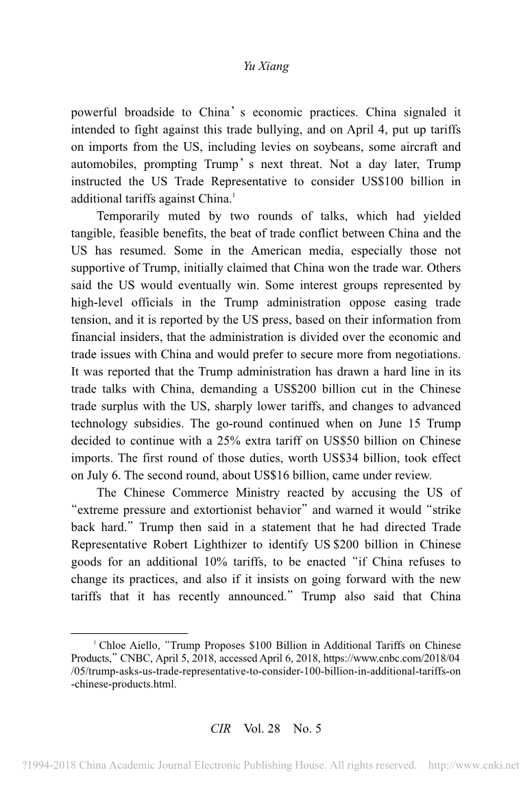 - Chloe Aiello “特朗普提议对中国产品征收1000亿美元的额外关税”,CNBC,2018年4月5日,2018年4月6日访问,https://www.cnbc.com/2018/04 /05/trump-asks-us-trade-representative-to-consider-100-billion-in-additional-tariffs-on-chinese-products.html.