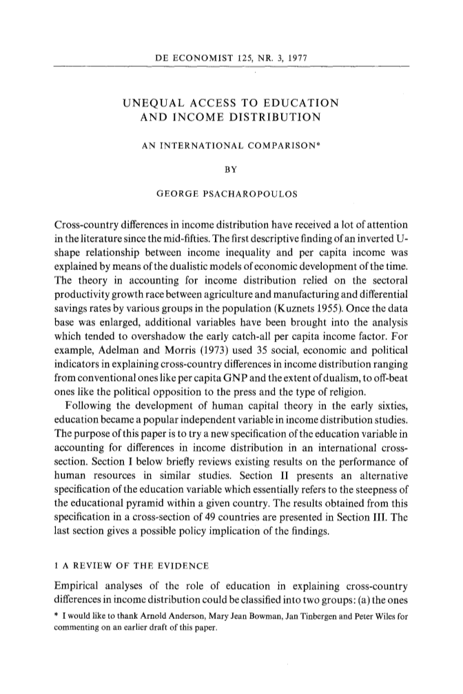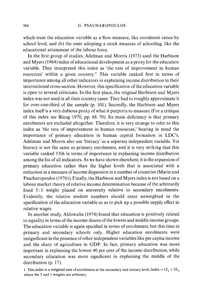 在第一组的研究中,阿德尔曼和莫里斯(1973)使用了哈比森和迈尔斯(1964)的教育发展指数作为教育的代理变量。他们把这个指标解释为在给定国家中人力资源的改进竞赛。这个变量的重要性在其他所有解释国家间收入分配差距的排名中排名第一。但是,这种教育变量的定义得到了一些批判性的观点。首先,最初的哈比森和迈尔斯指数没有被应用到所有的国家案例中:它们必须要求大致近似的结果超过样本的三分之一。第二,哈比森和迈尔斯指数本身就是一个声称能够解释的没有把握的代理值(对这个指标的批判索引请关注布劳 1970,pp. 68-70)。它最主要的的缺陷是,小学升学率这项数据被完全排除在外。因此,把这个指标当做人力资源的改善竞赛来参考非常奇怪,牢记了初等教育在LDC的人力资本形成中的重要性。阿德尔曼和莫里斯也使用“素养”作为一个单独的独立变量。然而素养不同于小学入学率,它在解释收入分配的因素的重要性列表中十分显著。像我们在其他地方提粗的观点,它是小学入学率的扩展,而是不是更高的层次。它与一些国家的一部分收入离散数据的减少相关联。(Marin和Psacharopoulos 1976)。最后,哈比森和迈尔斯指数不是基于相关收入决定的劳动力市场理论。因为其专断地把任意固定的5:1的比重放在了大学入学率和相对应的次要的入学率。显然,相对学生人数应该对这个指标来说是无关紧要的,以便是相对应的工资获得一个可能的供应影响。