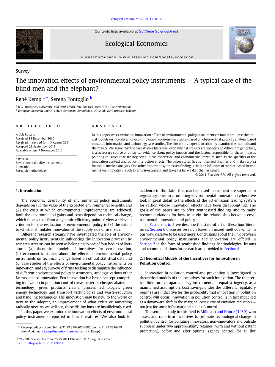 Requate and Unold(2003)和Requate(2005)对环境政策对创新使用和发展(包括研发)的激励机制进行了理论研究。 Requate(2005)总共检验了28种不同的模型,并得出结论:“似乎很难得出明确的结论,政策工具在其他政策工具上占主导地位。然而,我认为人们可以得出主要结论,即通过价格机制提供激励的工具大体上比指挥和控制政策表现得更好“(Requate,2005年, 193页)。要求还指出,传统模型中缺乏一些相关方面,如创新产出市场和环境政策工具提供的短期和长期激励措施之间的冲突,应将其纳入分析。