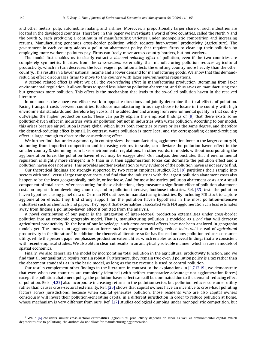 我们论文的新贡献是部门间生产的外部性下的跨境整合污染成为一个经济地理模型。也就是说,制造业污染被建模为一个不好的,这将减少农业生产力。据我们所知,跨部门尚未分析地理模型的影响。在已知的文献中抗聚集力如拥塞直接减少工业而不是农业生产力。此外,目前的理论文献主要集中在污染如何降低消费者效用,而本文强调生产的外部性,这使我们能够揭示的结果是一致的与最近的实证研究。我们也获得明确的结果,在一个解析解的方式,这是罕见的空间经济学模型。