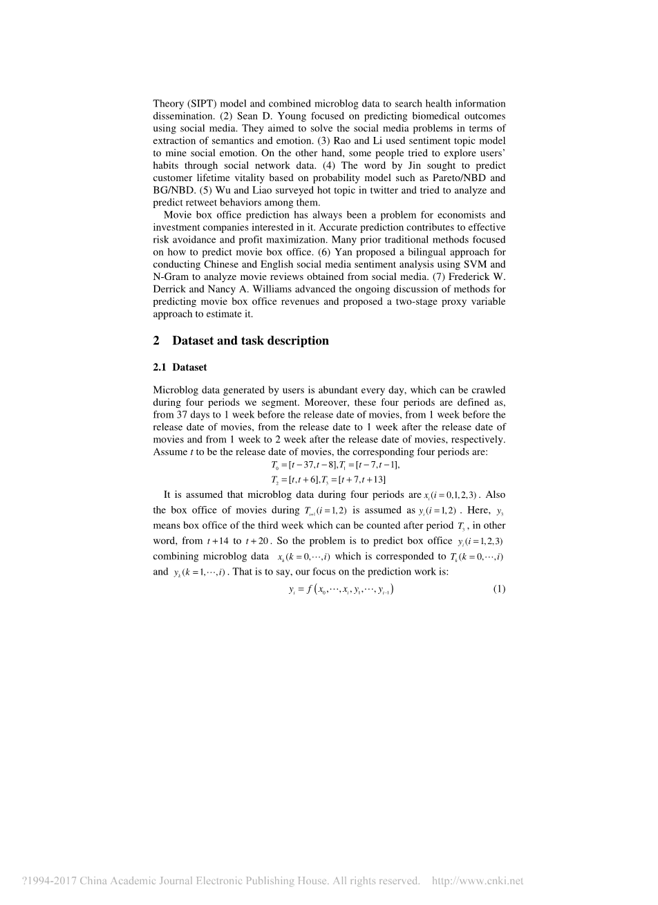 随着社交媒体快速的进步,许多研究领域由此衍生值得进一步开发探索。从全球范围来看,电影行业是增长最迅速的产业。每年都有成千上万部的电影上映,电影市场年均复合增长率也在逐年增长。然而人们的喜好是非常难预测的,一部电影上映之后,能够满足自负盈亏的平衡点具有相当高的风险,所以,电影票房预测一直是电影行业非常关注的问题。 电影票房的研究在经历“观众研究”和利用元数据、多因子的方法进行模型改进和影响因子的研究阶段之后,研究者们充分利用了网民在线生成的海量内容作为预测的主要信息来源,建立了更加高效、准确的票房预测模型。预测算法都是在电影上映之前进行的,预测进行的越早价值越大,但是由于互联网数据的滞后性,是电影上映之前和发布之后的微博数据量差距特别大,电影上映之前的微博数据量占总量的一小部分,大多数的微博数据都集中在电影上映的第一天或者是第一周,模型预测的性能和准确性一般都不高。