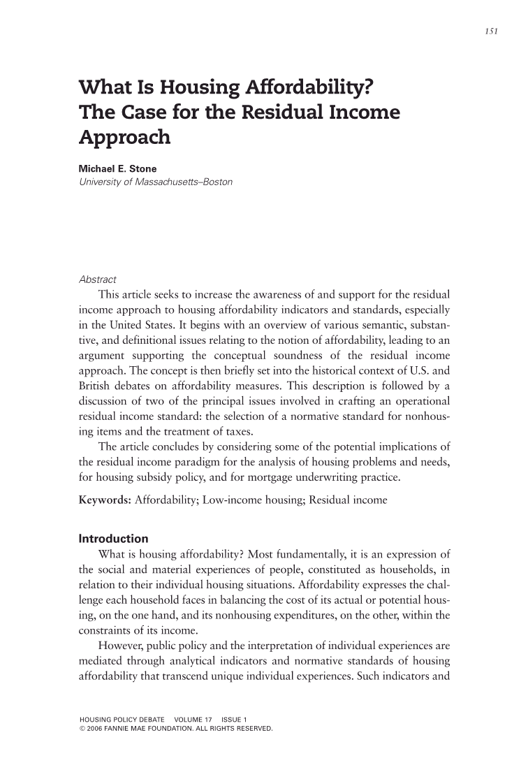 摘要:本文旨在提高对住房支付能力指标和标准的剩余收益方法的认识和支持,特别是在美国。它首先概述了与可承受性概念有关的各种语义、实质性和定义性问题,从而引出了支持剩余收益方法的概念合理性的论点。这一概念随后被简单地纳入美国和英国关于负担能力的辩论的历史背景。在此之后,我们将讨论制定业务剩余收入标准中涉及的两个主要问题:选择非住房项目的规范性标准和税收的处理。本文的结论是,考虑到剩余收益范式对住房问题和需求分析的潜在影响,住房补贴政策和抵押贷款承保实践