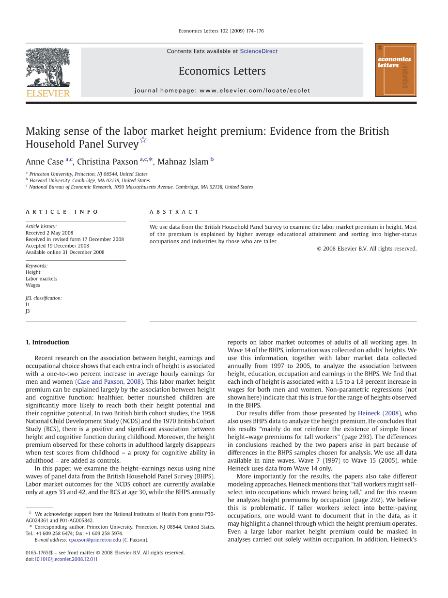 Case,A.,and C.Paxson ,and M.Islam Princeton University, Princeton, NJ 08544, United States