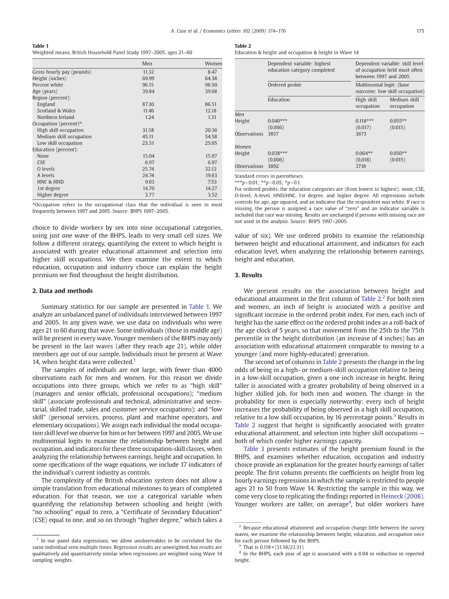在第14组英国家户委员会调查(BHPS)中,收集了成年人的身高这一信息。我们利用这一信息,以及从1997年到2005年每年收集的劳动力市场数据,分析英国家户委员会调查(BHPS)中身高、教育、职业和收入之间的联系。我们发现,每一英寸的身高增长都与男性和女性的工资增长1.5到1.8%有关。非参数回归(这里没有显示)表明在英国家户委员会调查(BHPS)中观察到的身高范围是准确的。