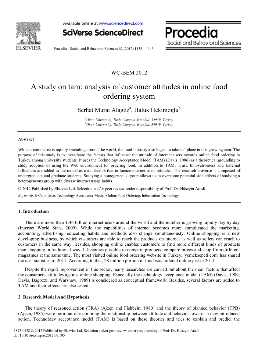 世界上有超过14.6亿的互联网用户,而且这个数字正在迅速增长(互联网世界统计, 2009)。当互联网的功能变得更复杂时,市场营销、会计、广告、教育习惯和方法也会同时改变。网上购物是一项新兴的发展业务,顾客可以通过网络接触到商品,而卖家也可以用同样的方式接触到顾客。此外,网上购物能让顾客找到比传统购物方式更多样的商品。我们可以在不同的网站上对比产品,对比价格并且进行购物。作为土耳其访问量最大的在线订餐网站,“yemeksepeti.com”分享了2011年的用户统计数据。根据这一数据,2011年网络订餐数量达2800万份。