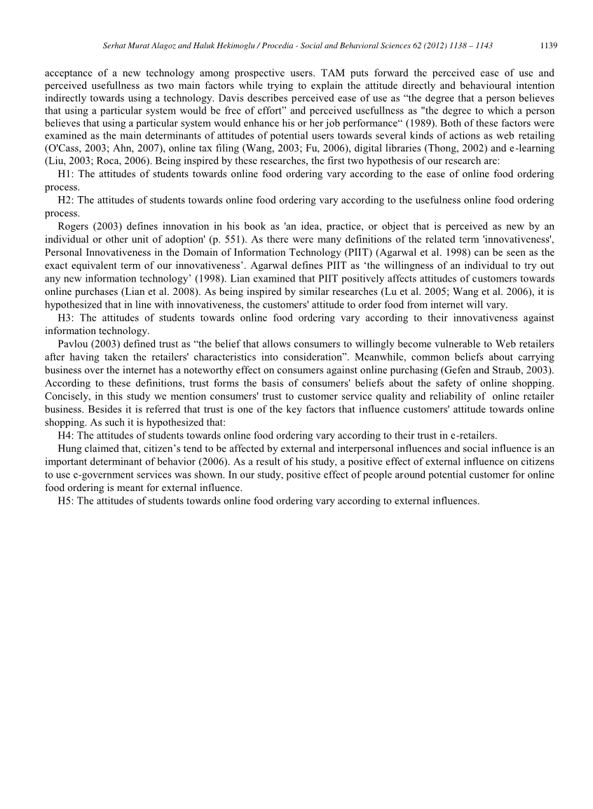 Rogers(2003)在他的书中将创新定义为“一种观念、实践或者是一个被一个人或另一个单位所认知的新事物”(p551)。由于对相关术语的“创新性”有许多定义,个人创新精神在信息技术领域(PIIT)(Agarwal等1998年)可以被看作是完全等效的创新性。Lian研究了PIIT对消费者对网上购物的态度的积极影响(Lian等2008)。受类似研究的启发(Lu等2005;Wang等. 2006),根据创新性不同,顾客对网络订餐的意愿会有所不同。
