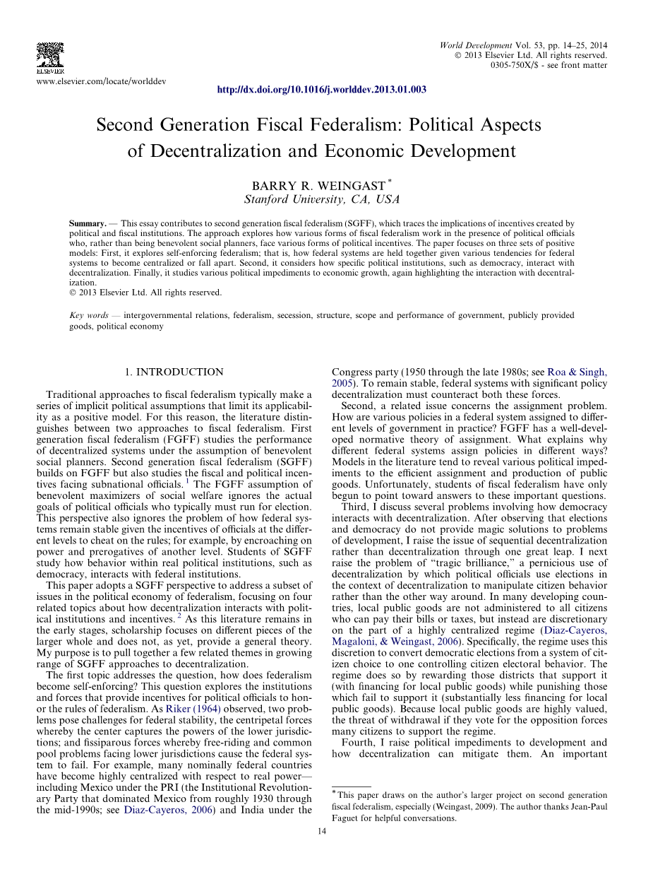 摘要:本文对第二代财政联邦主义(SGFF)作了贡献,它追溯了政治和财政机构所创造的激励的含义。该方法探讨了各种形式的财政联邦主义如何在政治官员面前发挥作用,这些官员不是仁慈的社会规划者,而是面临各种形式的政治激励。本文主要关注三组积极模式:第一,探索自我执行的联邦制;也就是说,考虑到联邦系统变得集中或分崩离析的各种趋势,联邦系统是如何保持在一起的。第二,它考虑了民主等具体政治机构如何与权力下放相互作用。最后,它研究了经济增长的各种政治障碍,再次强调了与权力下放的相互作用。