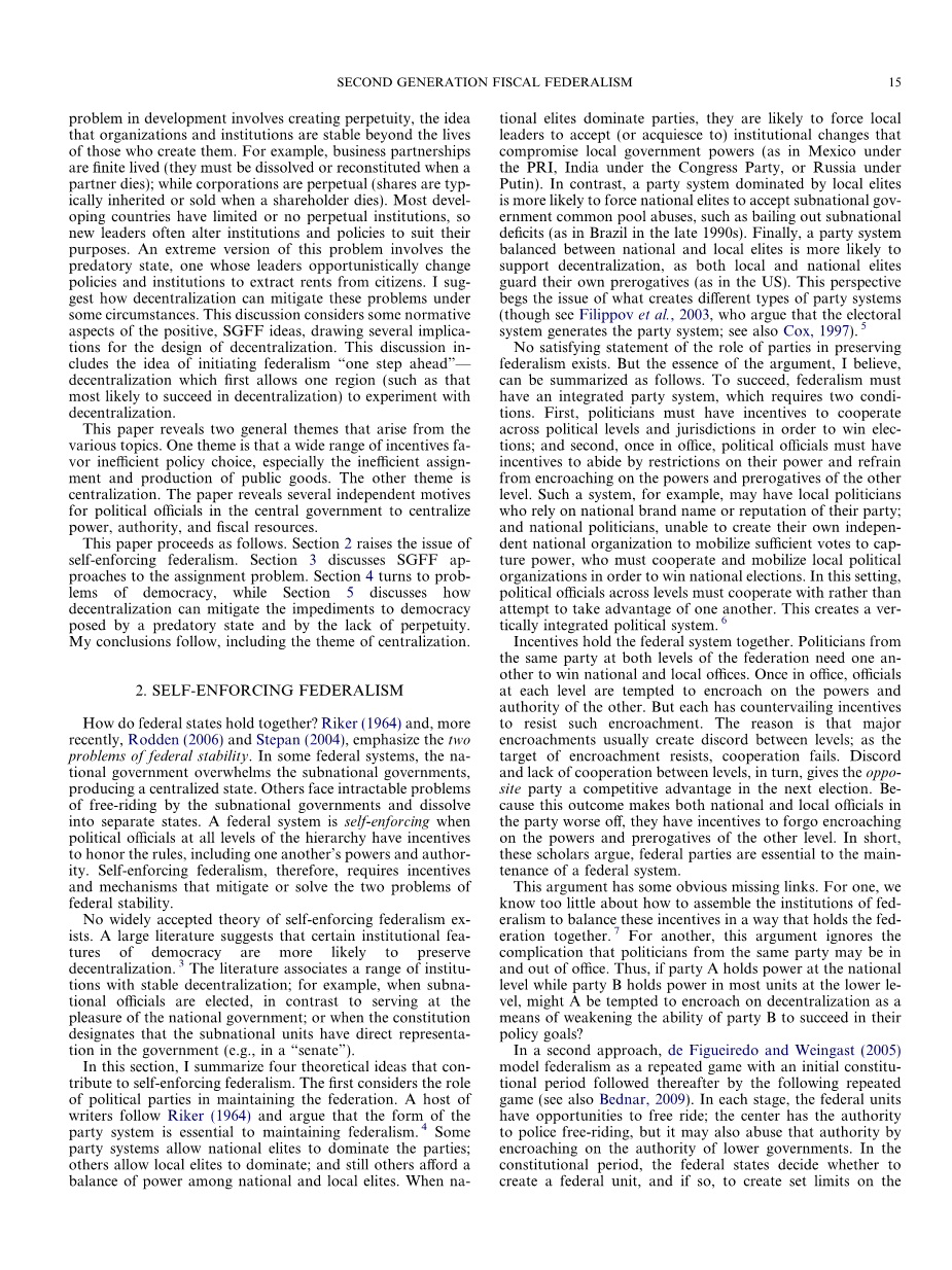 第一个主题针对的是这样一个问题:联邦主义如何变得自动执行?这个问题探究的是那些为政治官员提供奖励以遵守联邦主义规则的机构和力量。如同Riker (1964) 可以观察到,两个问题对联邦的稳定构成了挑战,即中心夺取下级司法权的向心力;以及分裂的力量,由此,较低司法权区面临的搭便车和常见的资金池问题导致了联邦体系的失败。例如,许多名义上联邦制的国家在实际权力方面已经高度集中——包括革命制度党(PRI,从1930年左右到20世纪90年代中期统治墨西哥的制度革命党)领导下的墨西哥;看见Diaz-Cayeros, 2006)和印度14国大党(1950年至20世纪80年代末;看见Roa amp; Singh,2005).为了保持稳定,具有重大政策权力下放的联邦制度必须抵消这两种力量。