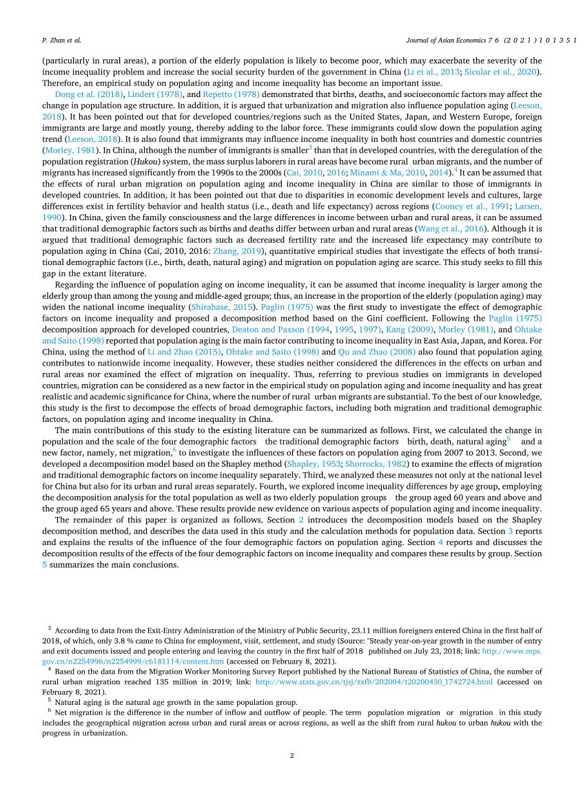 Dong et al.(2018)Lindert (1978)Repetto (1978)证明出生、死亡和社会经济因素可能会影响人口年龄结构的变化。此外,有人认为城市化和迁移也会影响人口老龄化(Leeson,2018)。有人指出,在美国、日本、西欧等发达国家/地区,外国迁移人数众多,而且大多是年轻人,从而增加了劳动力。这些迁移可以减缓人口老龄化趋势(Leeson,2018)。研究还发现,迁移可能会影响东道国和本国的收入不平等(Morley,1981)。在中国,虽然迁移人数比发达国家少3,但随着户籍制度的放开,农村大量富余劳动力变成了城乡流动人口,流动人口增加了。从20世纪90年代到21世纪初,迁移人数显著增加(Cai,2010,2016;Minamiamp;Ma,2010,2014)。4我们可以假设,农村-城市迁移对中国人口老龄化和收入不平等的影响与发达国家的迁移相似。此外,有人指出,由于经济发展水平和文化差异,不同地区的生育行为和健康状况(即死亡和预期寿命)存在较大差异(Cooney et al.,1991;Larsen,1990).在中国,考虑到家庭意识和城乡收入的巨大差异,可以假设出生和死亡等传统人口因素在城乡之间存在差异(Wang等,2016)。尽管有人认为传统的人口因素如生育率下降和预期寿命的增加可能导致中国人口老龄化(Cai,2010,2016:张,2019),但调查过渡人口因素(即出生、死亡、自然老龄化)和迁移的影响的定量实证研究关于人口老龄化的报道很少。本研究旨在填补现有文献中的这一空白。