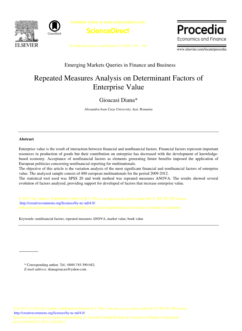 企业价值是财务和非财务因素相互作用的结果。财务因素是商品生产中的重要资源,但其对企业的贡献随着知识经济的发展而下降。 接受非财务因素作为产生未来利益的要素,迫使跨国公司适用欧洲关于非财务报告的政策。本文的目的是对企业价值最重要的财务和非财务因素进行变异分析。分析样本由2009-2012年期间400家欧洲跨国公司组成。所使用的统计工具是SPSS 20,重复测量方差分析的工作方法。 结果显示,通过分析多种因素的变化,为提高企业价值的因素提供了支持。