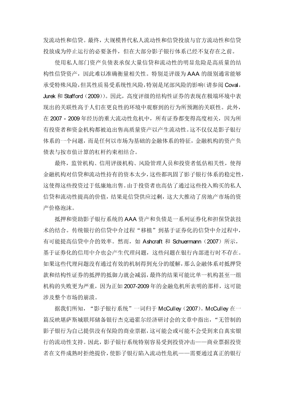 The obvious danger in using private sector balance sheets to underwrite large quantities of credit and liquidity puts against high-quality structured credit assets is the difficulty in accurately measuring correlation. In particular, AAA-rated tranches are generally structured to withstand idiosyncratic risk, but by their nature are vulnerable to systematic risk and particularly tail risk (see Coval, Jurek and Stafford (2009)). Consequently, the performance of highly-rated structured securities exhibits higher correlation in an extreme environment than one would predict from observed behavior in a more benign environment. Moreover, in a major liquidity crisis of the type experienced in 2007-2009, all securities become highly correlated as all investors and funded institutions are forced to sell high quality assets in order to generate liquidity. This is not simply an issue for the shadow banking system, but is a feature of any market-based financial system where financial institutions’ balance sheets are tied together with mark-to-market leverage constraints.