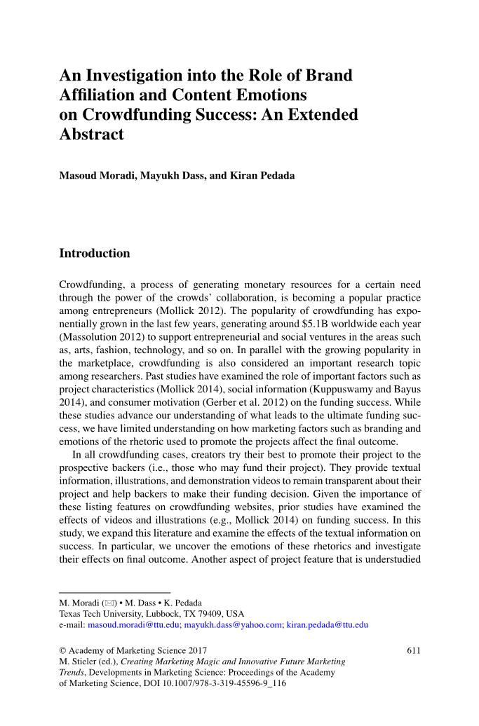 众筹,一种产生一定需要货币资源的过程通过群众合作的力量,正在成为一种流行的做法。在企业家(莫里克 2012)。众筹的普及已经在过去的几年里成倍增长,全世界每年产生约51亿美元(玛索鲁信 2012)支持创业和社会事业等领域中如艺术、时尚、科技等。与日益普及市场上,众筹也被认为是一个重要的研究课题研究者。过去的研究已经研究的重要因素,如项目的特点(莫里克 2014),社会信息(卡普斯迈和拜烨思 2014)、和消费动机(格伯等人。2012)关于资金的成功。而这些研究促进了我们对导致最终资金成功的原因的理解,,我们对营销要素,如品牌和情感的修辞,以促进项目影响最终结果。
