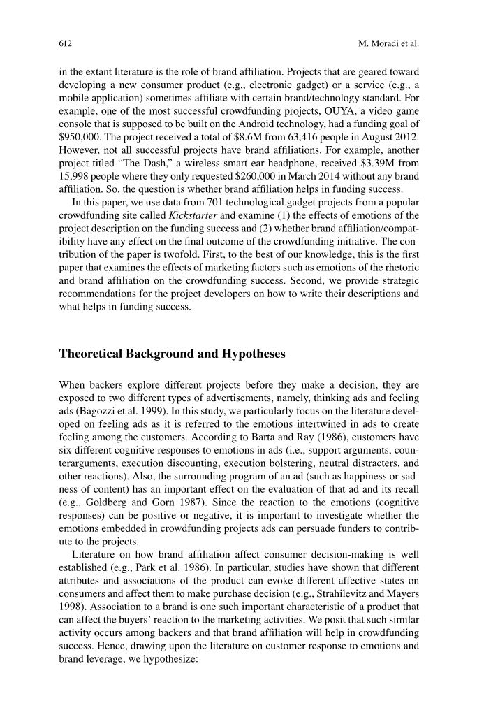 在本文中,我们使用的数据来自一个流行的701个技术小工具项目众筹网站 “敲门砖”和检查称为(1)情绪的影响在资金成功项目的说明,(2)无论是品牌联营/兼容性对众筹计划的最终结果有任何影响。纸张的贡献是双重的。首先,据我们所知,这是第一次研究营销因素的影响,如情感的修辞与品牌联系的众筹成功。第二,我们提供战略建议项目开发人员如何写他们的描述和有助于资助成功。