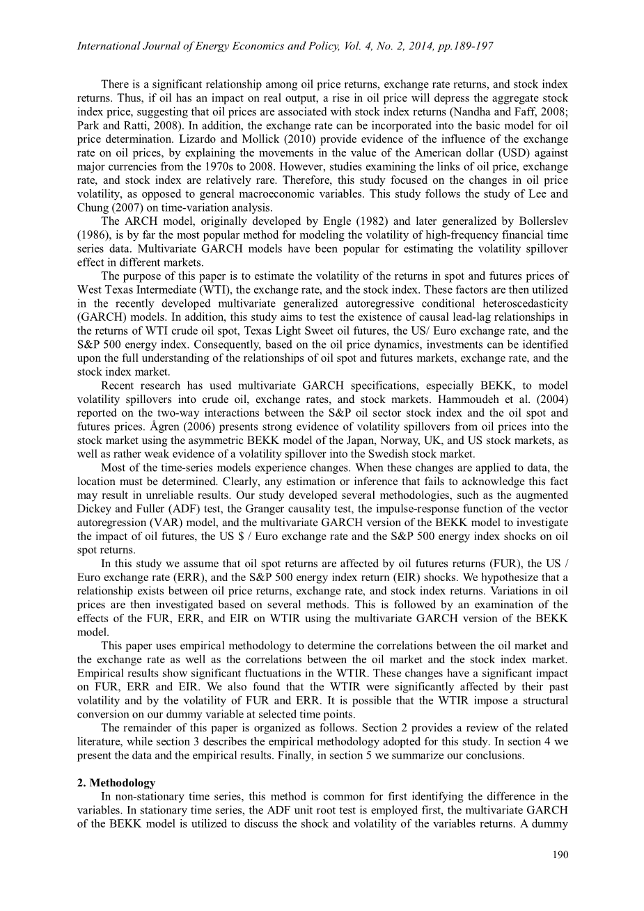 原油价格收益与外汇收益以及股票收益之间的关系越发明显,因此,如果石油价格对产量有一定影响,那石油价格的上涨必会给股票市场带来负面影响,这表明石油价格与股票市场紧密相连。(Nandha和Faff,2008;Park和Ratti,2008)。此外,汇率可作为石油定价模型的一个关键因素。Lizardo和Mollick(2010)通过分析美元从1970年代至2008年期间价值变化,为汇率变化对石油价格影响提供了一定证据。但是,关于石油价格、汇率以及股票指数的研究却相对较少。因此,本文侧重研究石油价格变动的波动性,而不是只考虑总体的宏观经济变量。本文以Lee和Chung(2007)的时间序列分析思想为研究思路。ARCH模型,最初是由Engle(1982)设计,随后Bollerslev(1986)对其进行了扩充,如今其已经成为最为流行的对高频金融数据的建模方法。多元GARCH模型也已经被广泛应用于对预测溢出效应对各类市场的影响。本文的目的是估计西德克萨斯中质油(WTI)的现货与期货价格、汇率以及股票市场的收益率的波动性。这些变量将会被应用于多远广义自回归异方差模型(GARCH)中。此外,本研究旨在测试WTI原油现货、德克萨斯轻质低硫原油期货、美元对欧元汇率以及标普500能源指数之间的因果滞后关系。因此,根据原油价格动态变化,我们可以通过理解原油现货与期货市场、汇率以及股票市场来认识金融投资。