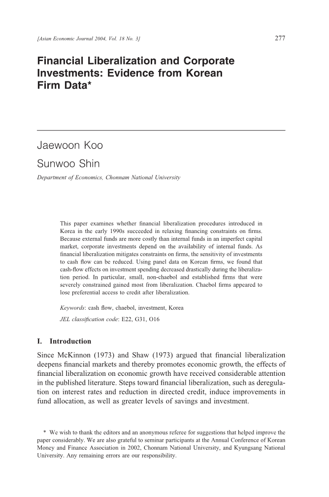 关键词:现金流,财阀,投资,韩国、金融自由化