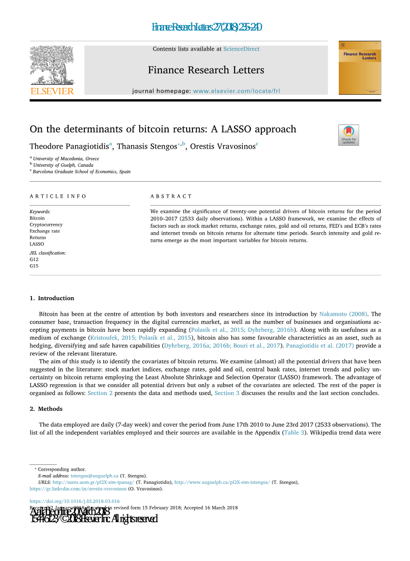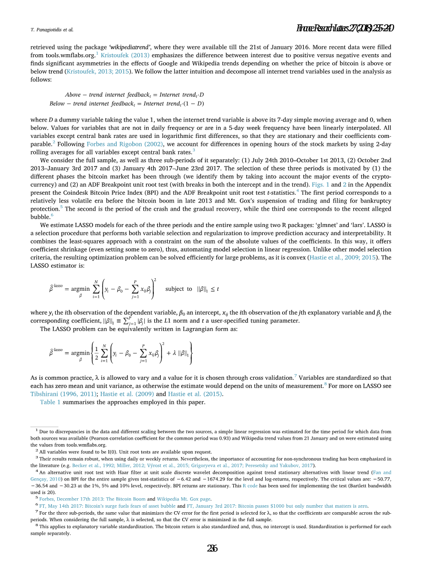 本研究的目的是确定比特币回报的协变量。我们几乎检查文献中提出的所有潜在驱动因素:股票市场指数,汇率,黄金和石油,央行利率,互联网趋势以及使用最小绝对收缩和选择操作框架(LASSO)的比特币收益的政策不确定性。LASSO回归的优点是我们考虑所有潜在的驱动因素,但只选择了一部分协变量。本文的其余部分安排如下:第2节介绍所使用的数据和方法,第3节讨论结果,最后一节总结。