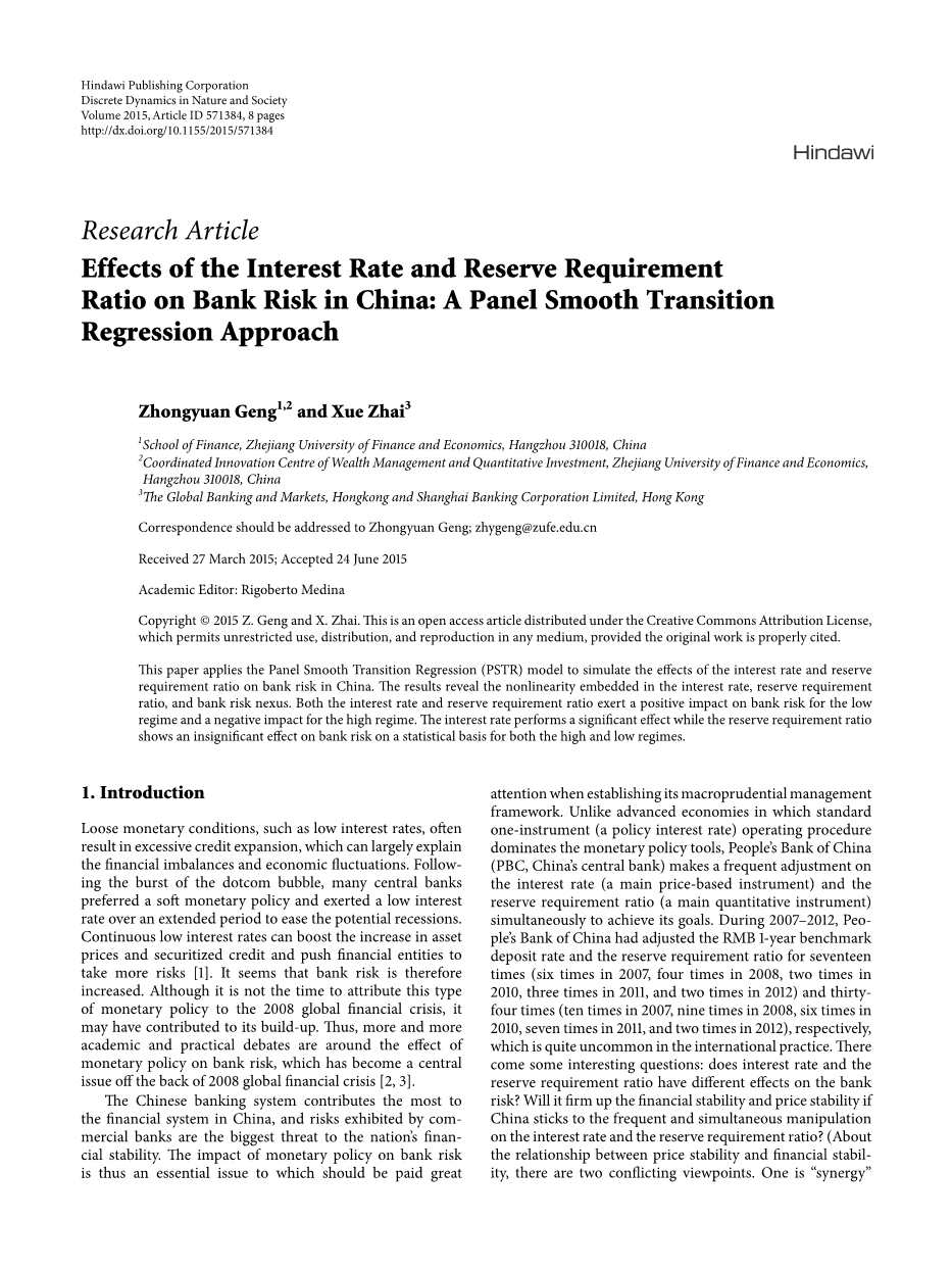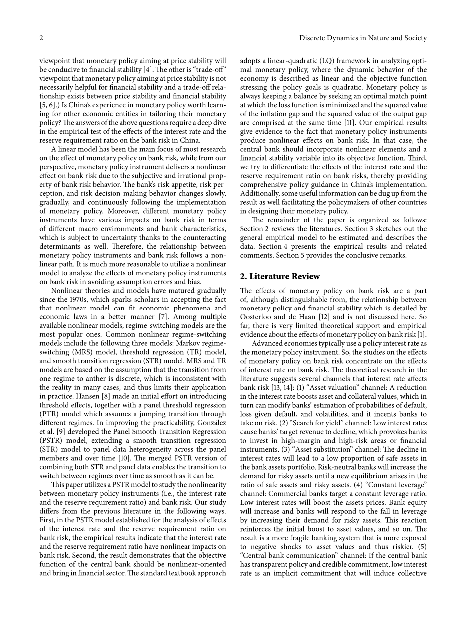 货币政策对银行风险的影响是Oosterloo和de Haan [12]详述的货币政策与金融稳定之间关系的一部分,虽然可以区分,但这里不再讨论。到目前为止,关于货币政策对银行风险影响的理论支持和经验证据非常有限[1]。发达经济体通常使用政策利率作为货币政策工具。因此,货币政策对银行风险影响的研究主要集中在利率对银行风险的影响上。文献中的理论研究表明利率影响银行风险的几个渠道[13,14] 。(1)“资产评估”渠道:利率下降提升资产和抵押品价值,从而改变银行的估值违约概率,违约损失和波动率,以及银行承担风险。(2)“寻找收益率”渠道:低利率导致银行目标收入下降,这促使银行投资于高利润和高风险领域或金融工具。(3)“资产替代”渠道:利率下降将导致银行资产组合中安全资产的比例较低。风险中性银行将增加对风险资产的需求,直到安全资产和风险资产的比率出现新的均衡。(4)“持续杠杆”渠道:商业银行的目标是持续杠杆率。低利率将提振资产价格。银行股权将增加,银行将通过增加对风险资产的需求来应对杠杆率的下降。这种反应加强了对资产价值的初步提升,等等。结果是一个更脆弱的银行系统,更容易受到资产价值的负面冲击,因此风险更大。(5)“中央银行通信”渠道:如果央行有透明的政策和可信的承诺,低利率是一种隐含的承诺,将引发集体道德风险。低利率意味着宽松的货币和监管环境,刺激银行承担更多风险。(6)“资产负债不匹配”渠道:当利率较低时,银行只能吸收短期存款。短期存款与长期项目融资之间的不匹配倾向于高杠杆。银行利用的杠杆越多,失败的风险就越高。(7)“习惯形成”渠道:如果利率低,投资者倾向于消费更多,预期信贷利差高。因此,投资者愿意并且能够从银行获得更多贷款或投资高风险金融工具,从而导致更高的银行风险。此外,一些研究表明,利率对银行风险的影响不确定,这取决于影响相互抵消力量的诸多因素[1]。利率变化对银行风险的影响可能随着时间的推移而变化。银行系统的变化或银行本身特征的变化[15]。实证研究显示一些相互矛盾的发现。其中一项发现声称低利率导致银行风险增加,高利率可能阻止其积累[16-19],而其他人[20,21]则认为反过来是正确的。有趣的是,Thakor [22],Jimenez等人。[23]和Martha Lopez等人。[24]记录了利率对银行风险的不确定影响。利率对资本较高的银行的风险资产影响较小,但对业务余额较多的银行影响较大。某些银行可以对利率变化做出异质反应。具有高资本充足率和收入多样化的银行在承担风险方面的表现更为根本。从上面引用的文献中可以注意到一些观察结果。首先,大多数先前的研究采用普通最小二乘法和广义最小二乘法建立线性模型,以研究货币政策在横截面或时间序列背景下对银行风险的影响。 Yener等人。[25]通过简单地将解释变量 - 信用扩张的二次项结合到线性回归方程中,研究了货币政策对银行风险的非线性效应,而没有建立尖端的非线性模型。其次,很少有研究比较利率和存款准备金率对银行风险的不同影响。在发达经济体,利率是主要的货币政策工具。因此,他们主要关注利率对银行风险的影响。在中国,一些学者关注利率和存款准备金率对银行风险的影响,但他们都得出了相同的结论,即利率和存款准备金率对银行风险都有负面影响[26,27]。