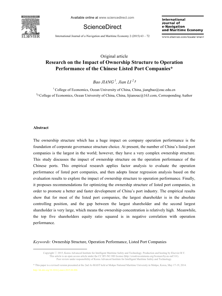 摘要:公司股权结构对经营绩效有着巨大影响,是公司治理结构选择的基础。如今,中国是世界上港口上市企业最多的国家,但是公司的股权结构却十分复杂。本文研究了中国港口公司股权结构对经营绩效的影响,运行成分分析法来衡量经营绩效,然后根据估计结果采用线性回归来研究股权结构与企业绩效之间的关系,最后,为了促进中国港口行业又快又好的发展,本文对股权结构的优化提出了建议。回归结果表明大多数港口上市公司第一大股东处于绝对控股地位,第一大股东和第二大股东持股比例的差异很大,意味着股权集中度相对比较高。同时,前五大股东持股比例的平方与公司绩效负相关。