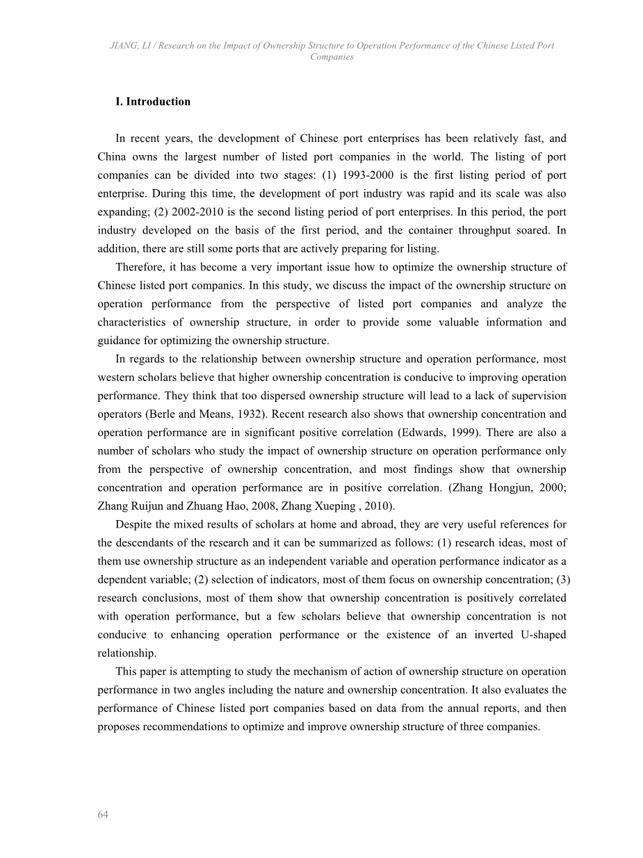 因此,如何优化中国上市港口企业的股权结构是一个重要问题。为了给优化股权结构提供有价值的信息和建议,本文从上市港口公司的角度讨论了股权结构对企业绩效的影响,并且分析了股权结构的特征。