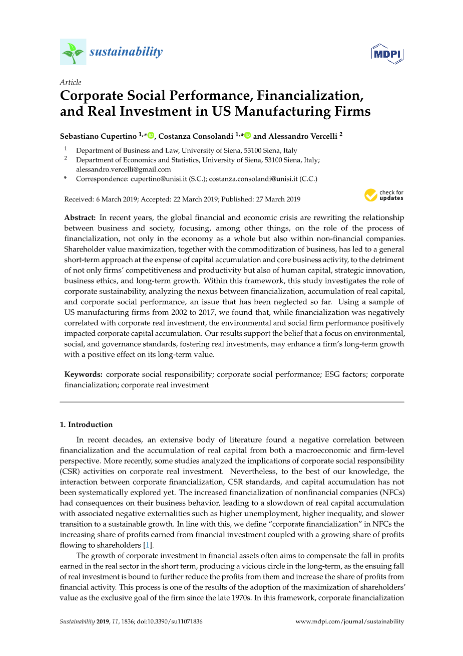企业对金融资产投资的增长,往往是为了弥补短期内实体部门所赚取的利润下降,从长期来看会形成恶性循环,随之而来的实体投资下降势必会进一步降低利润并增加金融活动的利润份额。这一过程是自 1970 年代后期以来将股东价值最大化作为公司的唯一目标的结果之一。在这个框架下,公司金融化导致管理者增加公司的短期价值,而不是维持资本积累和核心业务活动,这不仅损害了公司的竞争力和生产力,而且损害了人力资本、战略创新、商业道德, 和长期增长 [ 2 ,3 ]。随着上一次经济和金融危机,金融化的负面影响出现,同时企业社会责任作为一种可能的公司治理模式重新产生了兴趣,重新定义了企业在社会中的作用[ 4、5、6、7、8、9、10 ]。因此,越来越多的公司开始重新考虑企业社会责任原则,将企业行为转向更可持续的战略,并以专注于长期价值创造的管理承诺为支持[ 10 , 11 ]。为此,管理者需要增加长期的实际投资 [ 5 , 12 ]。
