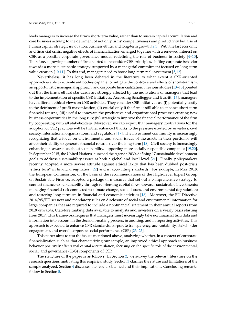 然而,长期以来,文献中一直在争论以 CSR 为导向的方法在多大程度上能够激活能够减轻短期主义、机会主义管理方法和公司金融化的有争议影响的抗体。以前的研究[ 13,14,15 ]指出,公司的道德标准受到管理者动机的强烈影响,这些动机导致了具体的企业社会责任倡议的实施。根据 Schaltegger 和 Burritt [ 16],管理者对企业社会责任活动有不同的道德观。他们认为企业社会责任举措是: (i) 成本高昂,不利于利润最大化;(ii) 仅当公司仍然能够提高短期财务回报时才至关重要;(iii) 有助于创新生产和组织流程,从长远来看创造新的商业机会;(iv) 通过与所有利益相关者合作来提高公司的财务业绩。此外,由于投资者、民间社会、国际组织和监管机构施加的压力,我们可以预期管理者采用 CSR 实践的动机将进一步增强 [ 17]。投资界越来越认识到,对投资组合中资产的环境和社会问题的关注将影响其长期产生财务回报的能力[ 18 ]。民间社会日益提高其对可持续性的认识,支持更多具有社会责任感的公司 [ 19 , 20 ]。2015 年 9 月,联合国启动了 2030 年议程,确定了 17 个可持续发展目标,以解决全球和地方层面的可持续发展问题 [ 21 ]。最后,政策制定者最近对金融监管中被称为危机后“道德转向”的道德松弛采取了更严厉的态度[ 22] 和会计准则。例如,2018 年 5 月,欧盟委员会根据可持续金融问题高级别专家组的建议,采取了一揽子措施,制定了一项综合战略,通过将资本流动重新导向可持续发展,将金融与可持续发展联系起来。投资;管理与气候变化、社会问题和环境退化相关的金融风险;并在金融和经济活动中培养长期主义[ 18]。此外,欧盟指令 2014/95/EU 为大型公司制定了新的强制性社会和环境信息披露规则,要求从 2018 年起在其年度报告中包含非财务报表,从而向分析师和投资者提供以下数据:从 2017 年开始每年进行一次。该框架要求管理者在决策过程、审计和报告活动中必须越来越多地考虑非金融公司数据和信息。这种方法有望提高企业社会责任标准、企业透明度、问责制、利益相关者参与和整体企业社会绩效 ( CSP ) [ 23、24、25 ] 。