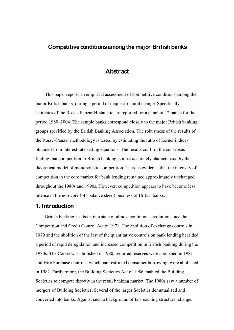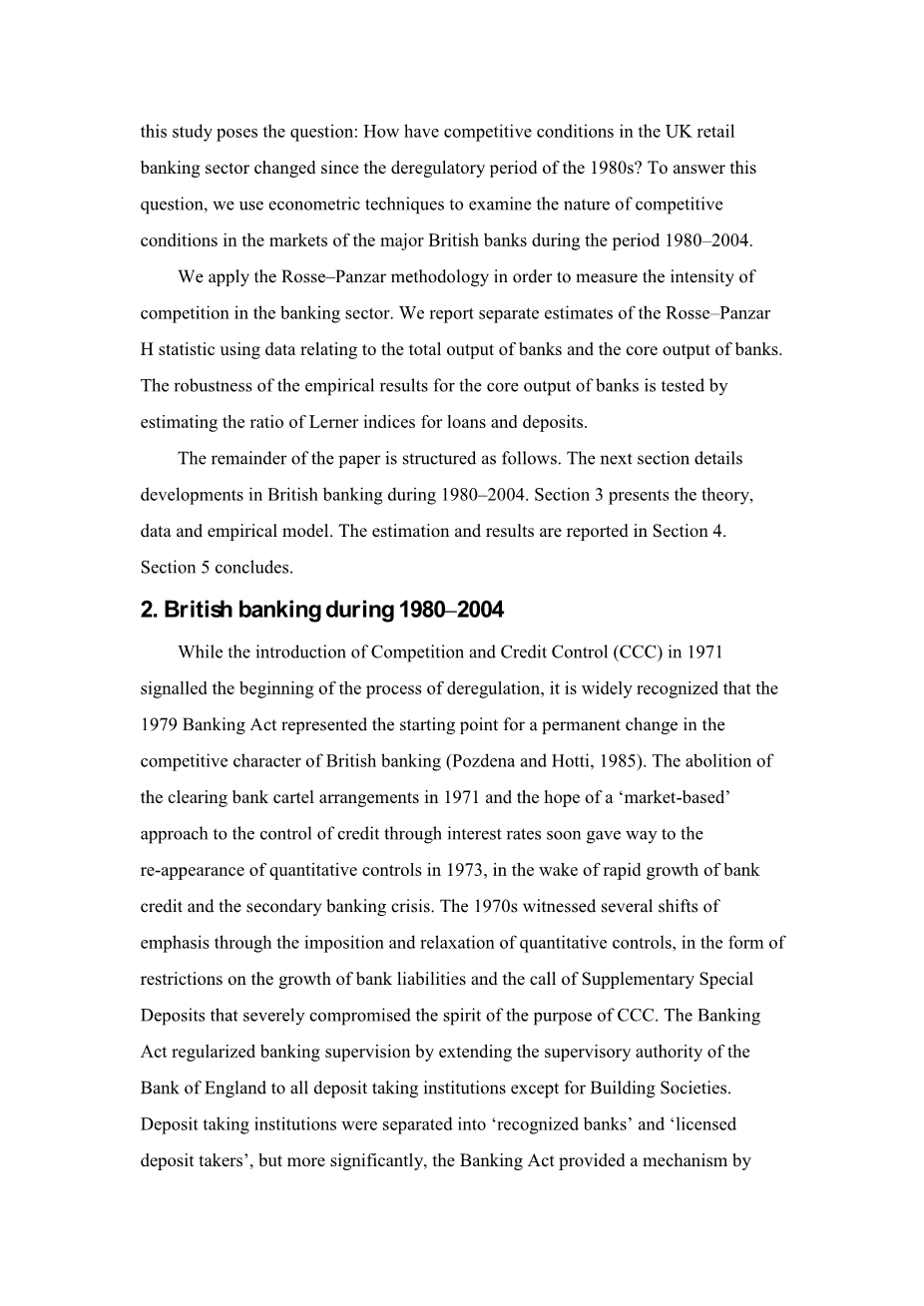 自1971年“竞争和信贷控制法案”以来,英国银行业一直处于不断演变的状态。1979年废除外汇管制和取消最后一次银行贷款的数量控制预示着20世纪80年代的英国银行业的一段时间的快速放松管制和激烈的竞争。1980年取消了,1981年废除了所需的储备,1982年废除了限制消费者借贷的雇佣控制措施。此外,1986年的“建筑社团法”使建筑协会能够直接在零售银行市场上竞争。20世纪80年代,建筑协会进行了多次合并。一些较大的社团脱离了共存,转变为银行。在这种影响深远的结构性变革的背景下,这项研究提出了一个问题:自20世纪80年代放松管制以来,英国零售银行业的竞争条件如何变化?为了回答这个问题,我们使用计量经济学技术来检验1980-2004年期间英国主要银行市场竞争条件的性质。