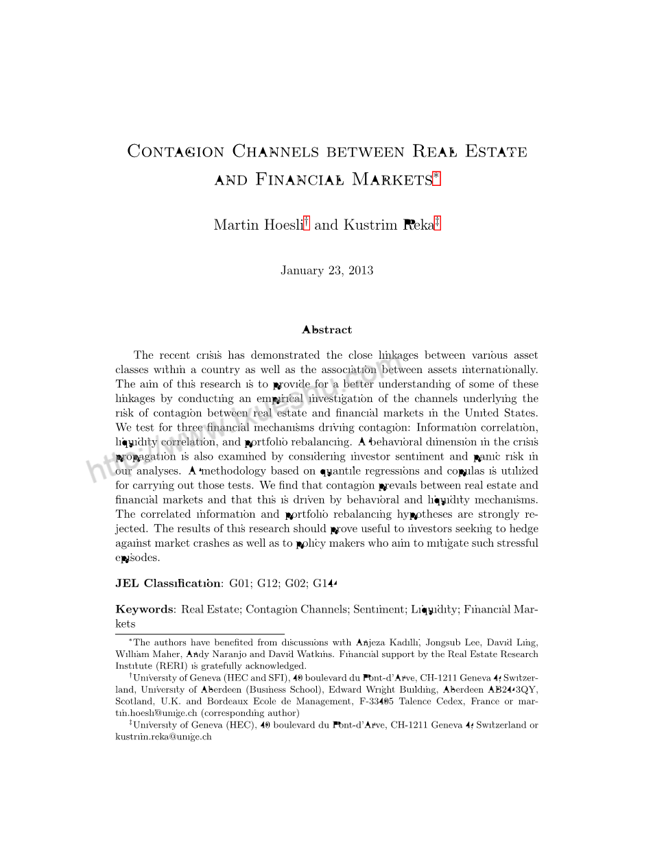 2007-2008年在房地产和金融市场中发生的极端事件以及当前债务危机及其传播到许多国家的威胁仍在继续,这加强了研究人员更好地理解推动国内和国际金融危机蔓延的机制的愿望。从宽松的角度来看,传染可以定义为一种快速的冲击溢出效应,可以增加跨市场的联系。然而,金融经济学文献中没有就传染的定义达成真正的共识。我们选择使用Bekaert,Harvey和Ng(2005)提出的定义,这些定义已在最近的研究中得到广泛应用。传染被定义为“超出经济基本面可能预期的相关性”;因此,通过共同冲击的“蔓延”被建筑排除在外。这一点至关重要,因为我们可能错误地得出结论,即通过观察两个市场之间相关性的增加来证明存在传染,而这种增加(通常在危机期间注意到)可能只是这两个市场暴露于常见的风险因素。因此,任何传染病分析的第一步是建立一个控制共同经济风险因素的定价模型。本研究的目的是通过关注美国房地产和金融市场之间的传染来研究国内市场(跨资产传染)过度共同的决定因素。